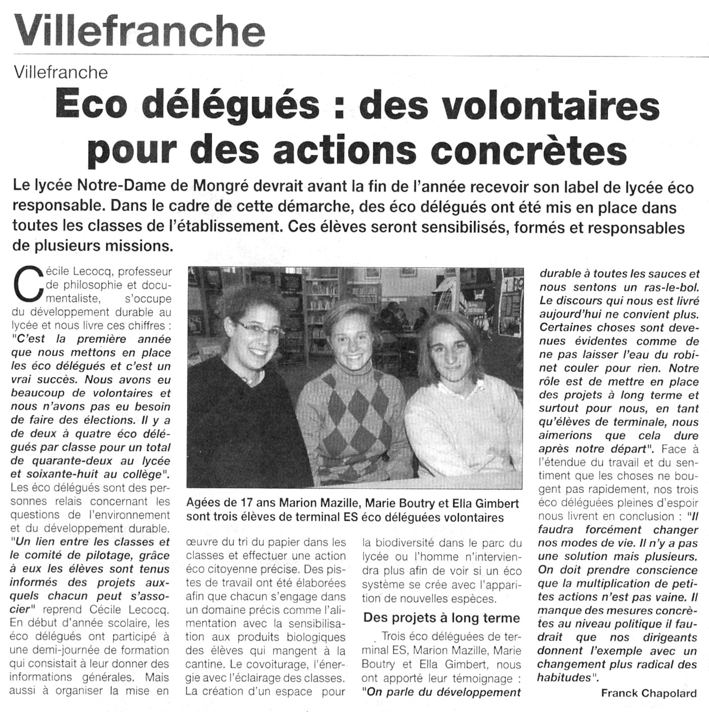En lien avec notre programme de Français (Mme Néau) et le thème de l’environnement auquel Mongré est fortement attaché, nous avons eu l’occasion de rencontrer au CDI (le 05 Octobre 2009) une conteuse partisane du respect de la planète. Madame Resche-Rigon est en effet non seulement une passionnée des contes mais aussi la directrice de la FRAPNA* de Villeurbanne.